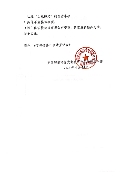 关于开展安徽皖能环保发电有限公司2023年4月信访接待日活动的通知