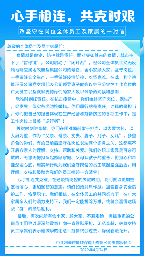 近日,利辛皖能环保公司党支部发出《致坚守在岗位的全体员工及家属的一封信》,以微信消息的形式“寄送”到公司每名员工的手里,传递到每位员工家属的心底,向舍小家顾大家、坚守岗位的员工及背后默默支持的员工家属表示衷心的感谢和问候。