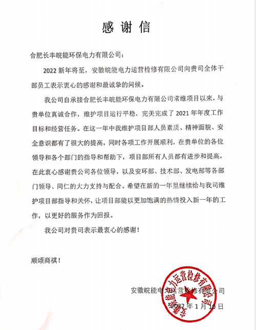 新年伊始,长丰皖能环保公司收到一封来自安徽皖能电力运营检修有限公司的感谢信,表达了对长丰公司全体干部员工的衷心感谢和诚挚问候。