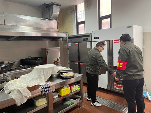 检查小组对后厨操作间、餐具清洗池、材料存储间进行了目视化检查,逐项查看了食堂工作人员体温登记表、防疫消毒登记表、卫生管理、餐具消毒、调味料存放、生熟食品分类等情况。