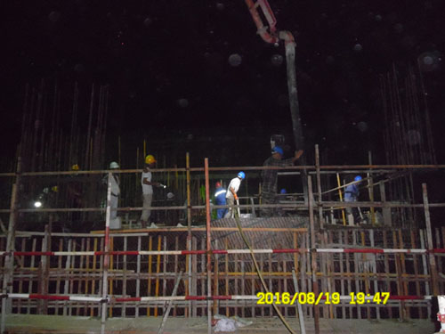 此次混凝土浇筑从8月19日上午9时开始进行,在项目建设、监理、施工等各参建单位的安全、质量、技术管理人员协同配合和后勤保障下,施工人员克服了烈日暴晒、高温酷暑、长时间连续施工作业等困难,于8月20日凌晨4时浇筑完成。此次混凝土浇筑从池底负6米到零米,共完成800余立方米。