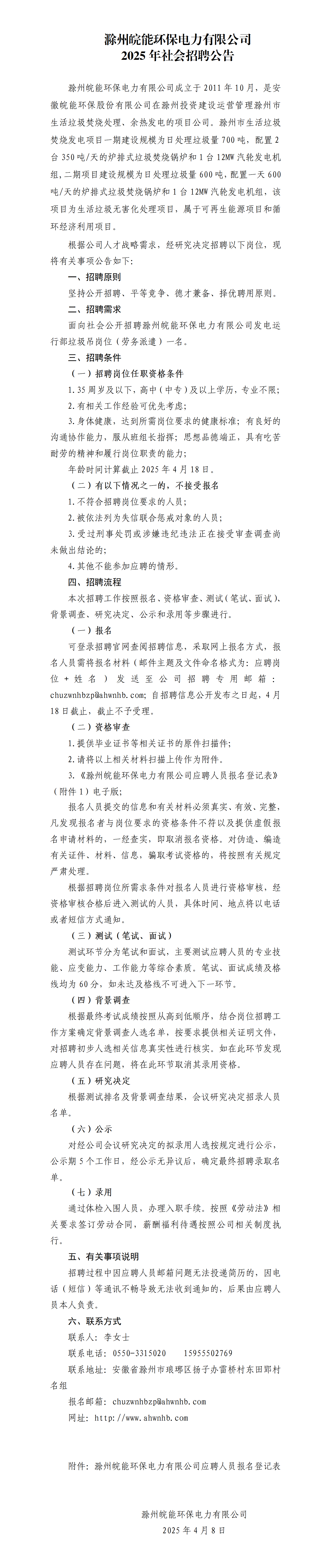 滁州皖能环保电力有限公司2025年社会招聘公告