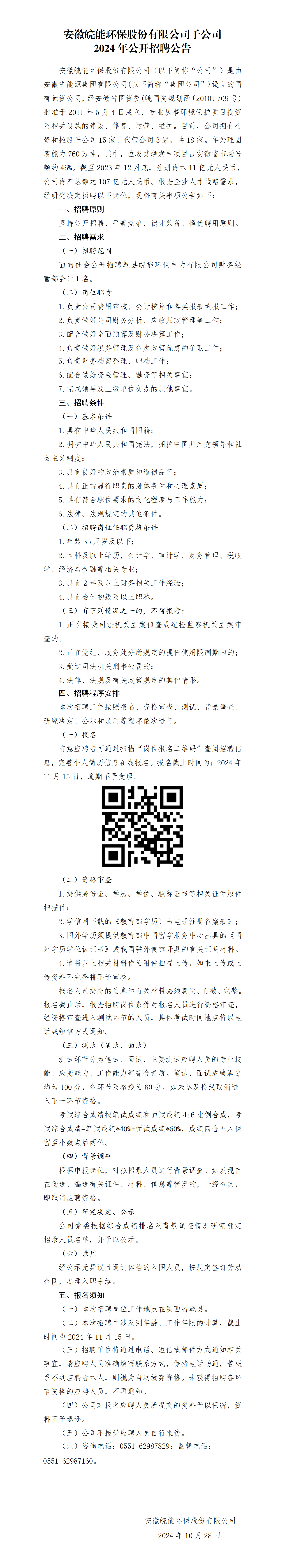 安徽皖能环保股份有限公司子公司2024年公开招聘公告