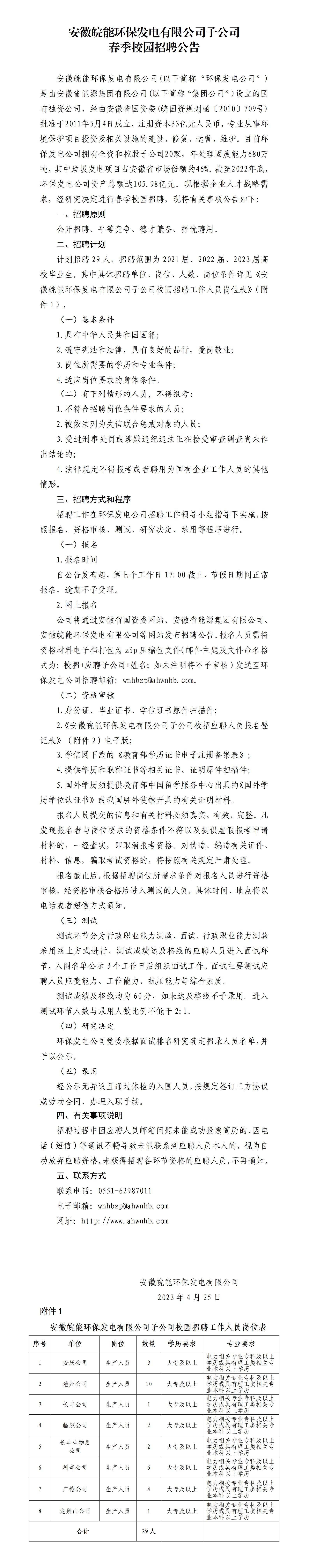 安徽皖能环保发电有限公司子公司春季校园招聘公告