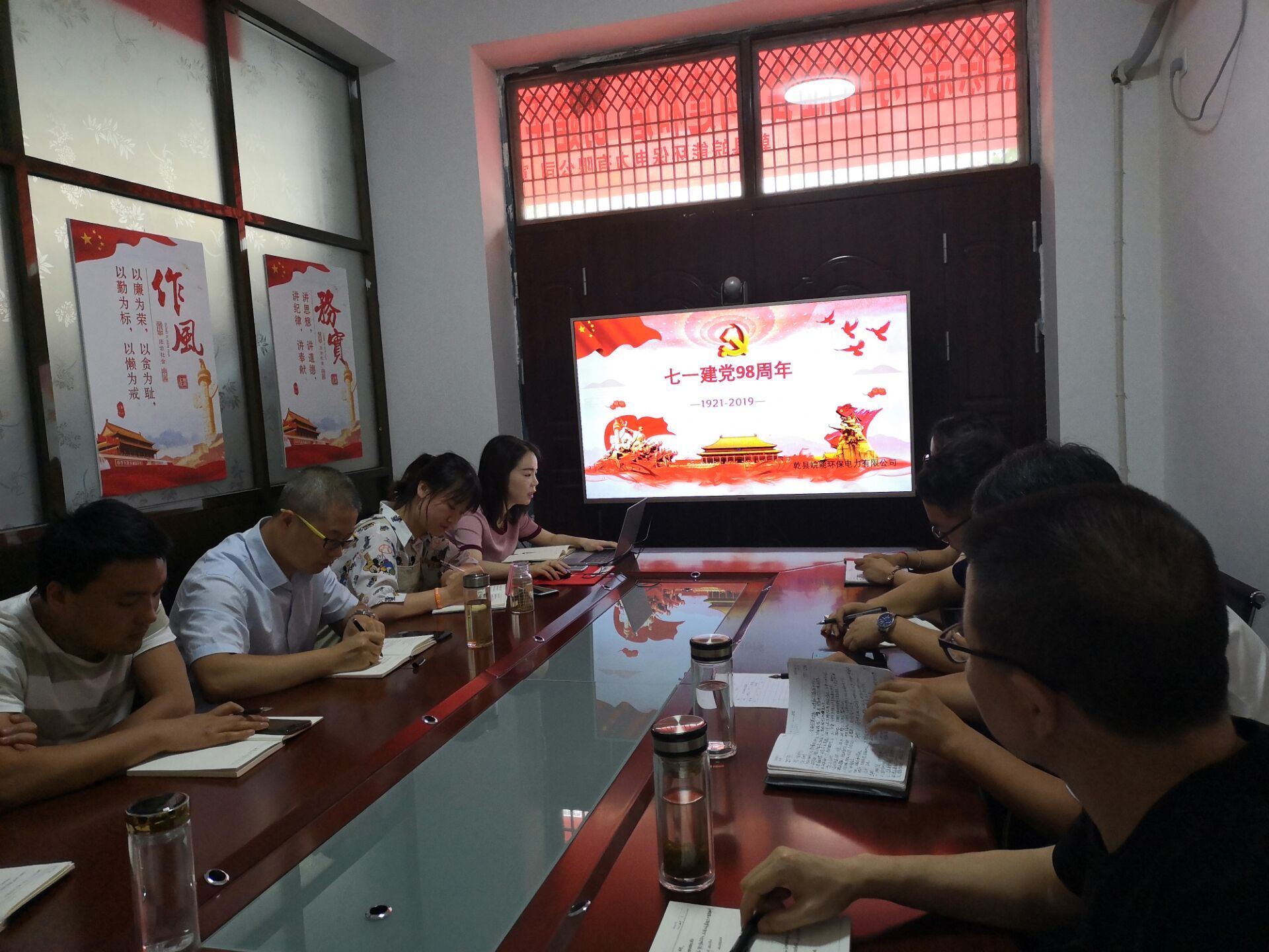 为热烈庆祝中国共产党成立98周年,培育党员干部先进性意识,激励党员干部守初心、担使命。近日,乾县皖能环保公司开展了“我和我的祖国”主题党课活动,公司全体人员参加会议。