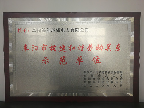 2020年11月17日,经阜阳市人力资源和社会保障局、阜阳市总工会、阜阳市企业家联合会、阜阳市工商业联合会评选审定,阜阳皖能环保公司荣获2020年“阜阳市构建和谐劳动关系示范单位”荣誉称号,并率先成立了由职工代表、公司工会代表组成的“阜阳皖能环保电力有限公司劳动争议调解委员会”。