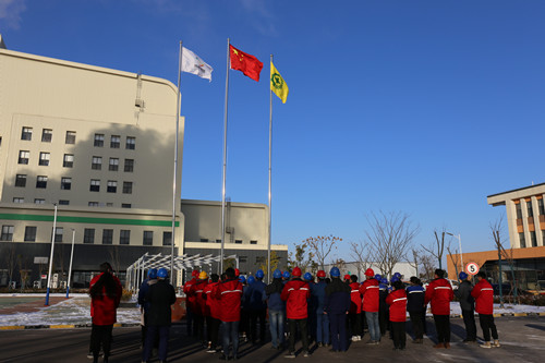 在激昂雄壮的国歌声中,迎着新年的晨风,鲜艳的五星红旗冉冉升起。全体人员行注目礼,庄严肃穆,祝愿伟大的祖国繁荣昌盛。