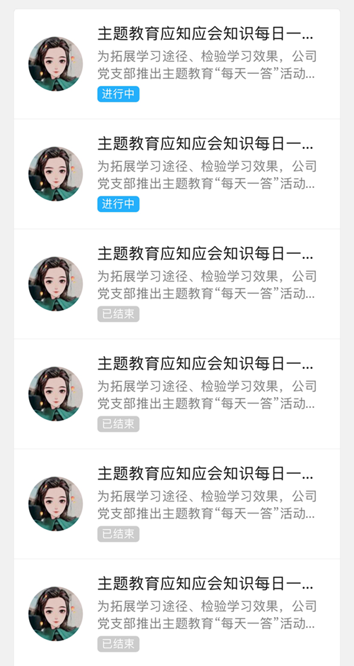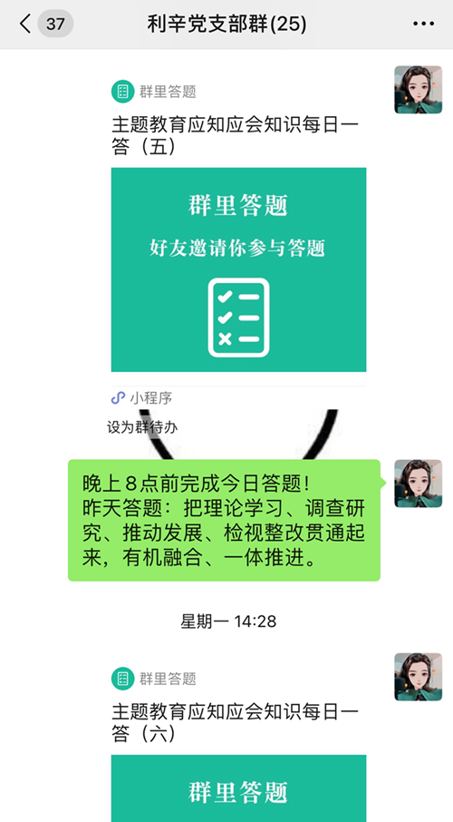 “每日一答”活动以主题教育应知应会为主要内容,每天根据学习内容编制问答题目。题目形式多样,设有选择、简答、判断等类型。最后,利用线上微信小程序定时推送到党员微信群中,让全体党员干部充分利用碎片化时间开展学习。