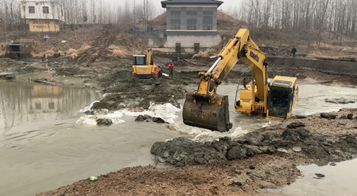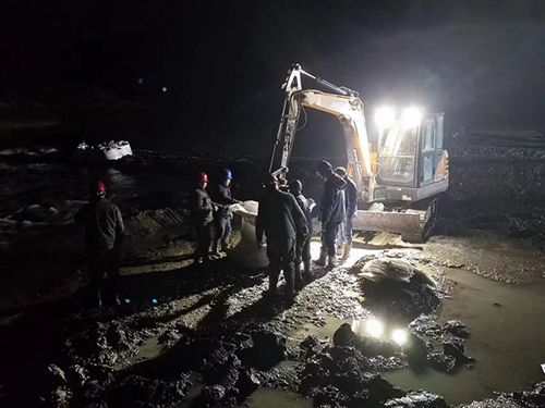 随着挖掘机到达现场,参与抢修的同志毫不迟疑地走入没过脚面的浅水淤泥中,寒意刺骨,但他们毫不畏惧,齐心协力用一袋袋装满泥沙的吨袋堵住决堤处。现场机器轰鸣,穿梭的水流如时间般不断流逝,一场与时间的竞速拉开了帷幕。受现场条件限制,技术部刘华鹏与安环部宋兴林两位同志,只能站在水中撑起吨袋,泥水不时溅至满身,甚至灌入胶靴,而此时的他们却浑然不觉。另一边,技术部马宏中、许再勇等同志争分夺秒地检修取水泵,为现场夜间工作拉起照明设备……最终,经过近两天两夜高强度的抢险工作,在取水口上游堆建了一道坝埂,让持续下跌的水位,缓慢上升起来,解决了燃眉之急,公司机组运行未受到影响。