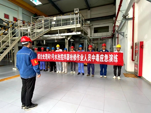 此次演练结合生产现场运行状态特点,模拟综合处理间1号水池搅拌器故障进行抢修作业期间,因抢修人员在水池内行走扰动池底浆液致使硫化氢释放,发生人员头晕恶心全身无力情况的场景。演练按照《有限空间事故现场处置方案》开展,整个过程紧张有序,各参演小组密切配合,圆满完成了本次演练任务。