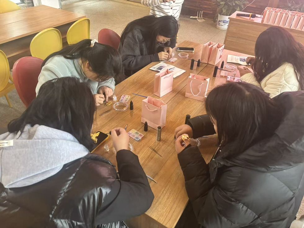 扎染体验结束后,进入螺钿胸针与发卡制作环节。螺钿工艺作为传统装饰瑰宝,以天然贝壳为原料,经打磨、雕刻、镶嵌等多道工序,方能呈现出绚丽晶莹的质感。女职工们精心挑选贝壳碎片,用镊子将其巧妙镶嵌在饰品底座上:有的勾勒出蝴蝶造型,粉色贝壳化作翅膀,栩栩如生;有的打造出爱心发卡,黄色贝壳点缀其间,宛若夜空繁星。半小时后,一件件精美饰品在指尖诞生,女职工们的脸上洋溢着自豪与满足的笑容。