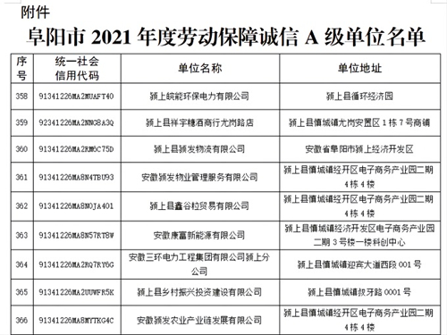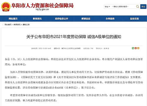 近日,阜阳市人力资源和社会保障局发布了《关于公布阜阳市2021年度劳动保障诚信A级单位的通知》,颍上皖能环保公司被评为阜阳市2021年度“劳动保障诚信A级单位”。