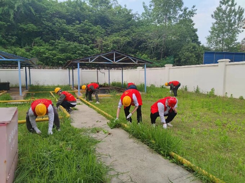 活动中,充满朝气的团员青年就像勤劳的小蜜蜂,他们按照责任区域划分,分工协作,在炎炎烈日下,将每一根杂草清除干净。活动现场一派热火朝天的劳动景象,一簇簇“志愿红”形成了一道道亮丽的风景线。团员青年们用实际行动为厂区的环境整治贡献青春力量。