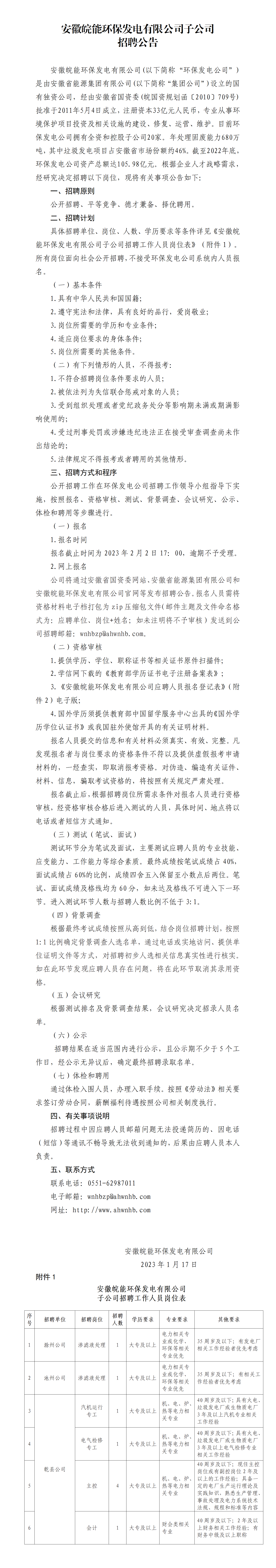 安徽皖能环保发电有限公司子公司招聘公告