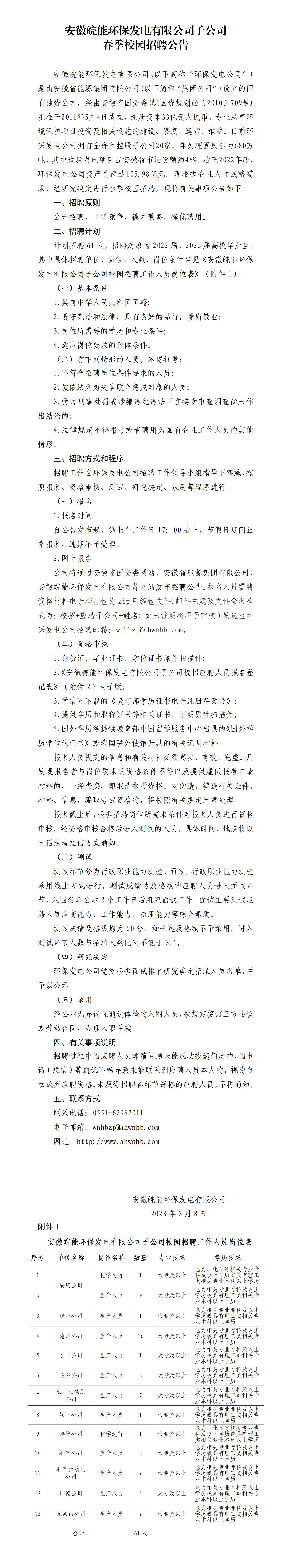 安徽皖能环保发电有限公司子公司春季校园招聘公告
