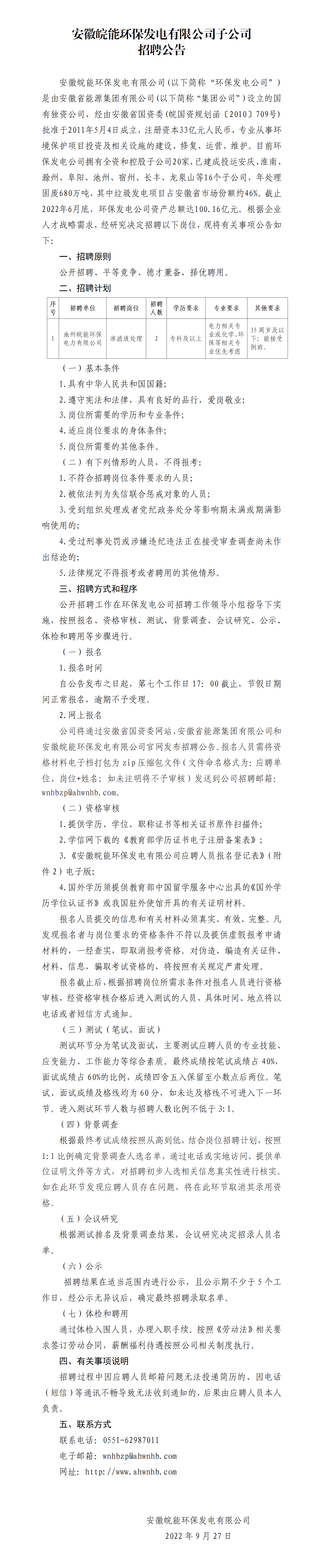 安徽皖能环保发电有限公司子公司招聘公告(池州公司)