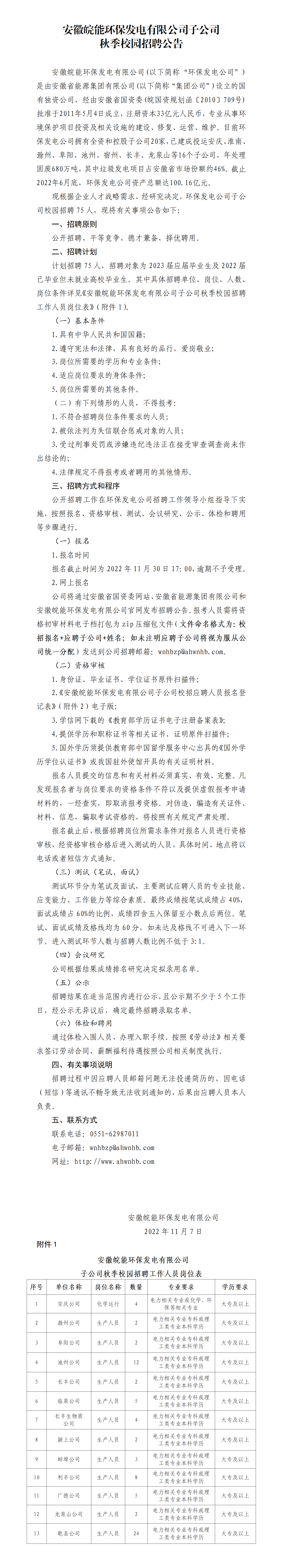 安徽皖能环保发电有限公司子公司秋季校园招聘公告