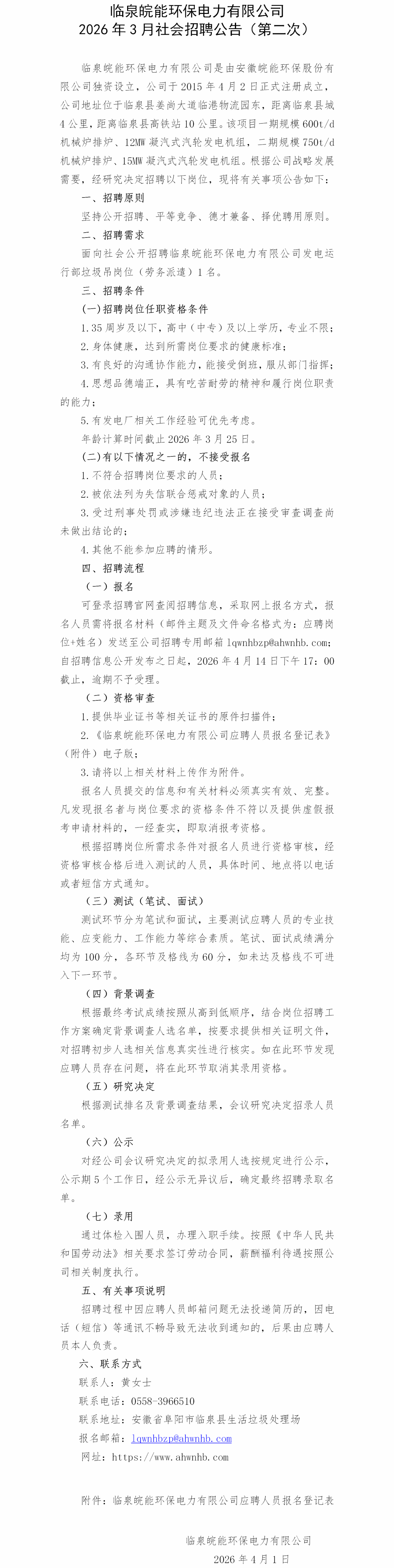 临泉皖能环保电力有限公司2026年3月社会招聘公告(第二次)