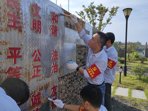 公司文化墙建设在户外,由于风吹日晒,墙体油漆掉色,部分构件有脱落现象,影响了文化墙的美观。7月25日,公司党支部组织党员志愿服务队,对公司文化墙墙面重新修复。为避免人员中暑,服务队利用清晨温度不高、阳光不强的时间段,对整个墙体重新粉刷、加固。活动中,由于墙面上有固定的亚克力字,无法移出,队员们先用砂纸打磨生锈的部分,再用油漆刷涂抹面积大的部分,然后用小笔刷对边角处收尾,最后对油漆沾染的亚克力字,统一用松香水进行处理。经过大家1个多小时的努力,整个墙面焕然一新。