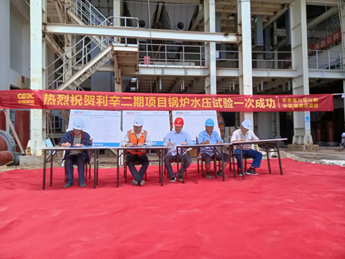 为做好本次水压试验,利辛公司周密部署、科学指挥,各参建单位协同作战,在水压试验期间对汽包温度、压力、膨胀指示器、升降压速率等进行全程监控,压力升至超水压6.0MPa,锅炉整体压力保持20分钟稳定无变化,降压至4.8MPa并稳压,检查受压系统部件无渗漏、无变形、无破裂现象。