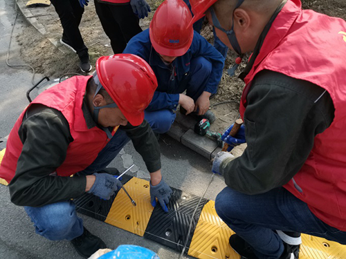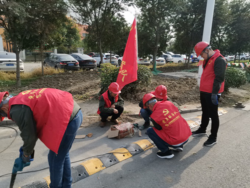 宿州公司位于206国道旁,来往大型车辆较多,且未设置减速带,导致驾驶员对路况提前预判不足、车速过快,存在一定的安全隐患。此次开展的主题党日活动,是有针对性地在公司门口铺设一条安全减速带,达到提示、减速、刹车作用。大家在公司党支部书记带领下,按照各自分工,相互配合,有的放线、有的搬运减速块、有的打孔、有的铆钉,干得如火如荼。经过近三个小时的辛勤劳动,一条长近30米的安全减速带铺设完成。