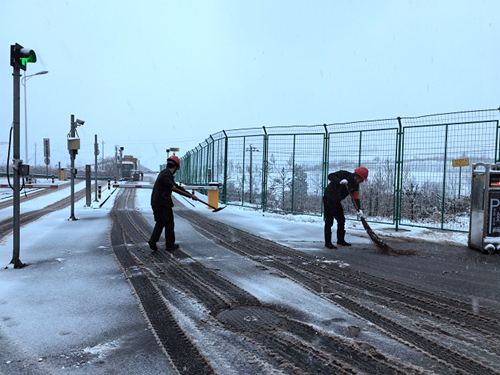 突击队队员们顶着风雪,拿着铁锹,抬着盐袋,一边清扫,一边撒盐,大家齐心协力,配合默契,经过近一小时的奋战,公司地磅房、廊道、综合楼出入口的积雪全部清扫干净,及时消除了安全隐患,为公司安全生产和职工出行扫清了障碍。