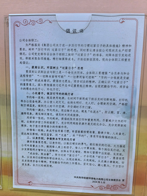 利辛皖能环保公司党支部向全体职工发出厉行节约习惯过紧日子倡议书