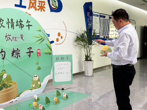 随着“钓粽子”活动开始,参与人员稳稳拿着一根钓竿和一根长线制成的垂钓工具,认真瞄准前方的粽子开始垂钓。有的人非常快速地就把粽子钓到手;有的人一通手忙脚乱,急得满头大汗也只能远远触碰到粽子。前面的员工全神贯注地参与游戏,后面排队的人也热心地在一旁出谋划策,整个场面热闹有趣。